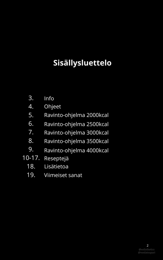MEAL PLAN 2.0 sisältää ateriavaihtoehdot aamupalasta iltapalaan saakka. Ateriakokonaisuudet: Aamupala, lounas, välipala, päivällinen sekä iltapala. Ravintoaineiden määrät ovat tarkasti näkyvissä. Nyt mukaan sisältyy myös reseptejä suoraan reseptikirjastamme! Ravinto-ohjelmaan sisältyvät näiden lisäksi vielä selkeät ohjeet ja kalorilaskuri. Lue lisää tuotetiedoista.